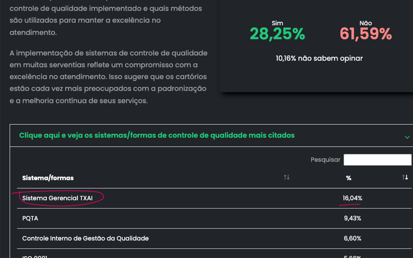 Entre os sistemas e formas de controle de qualidade mais citados, o Sistema Gerencial TXAI lidera o ranking, com 16,04% de menções. Em seguida aparecem o PQTA (9,43%), o Controle Interno de Gestão da Qualidade (6,60%) e a ISO 9001 (5,66%).